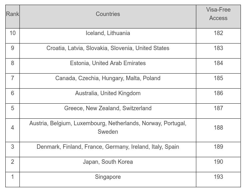 Japan and South Korea are in second place, with passports that offer access to 190 countries.