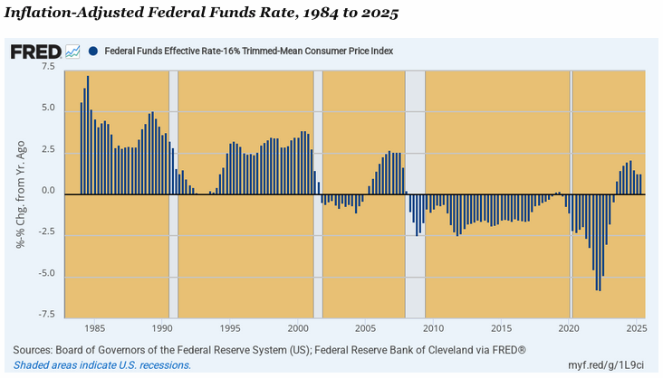 Moreover, at the present moment, the story is even worse. The Donald was pounding the table for a 300 basis point cut a few weeks ago when, during Q2 2025, the inflation-adjusted Fed funds rate had posted at just +1.27%. So what he apparently wants is a return to the inflationary Fed print-a-thons of the last several decades and to an implied inflation-adjusted Fed funds rate of, well, -2.27%.