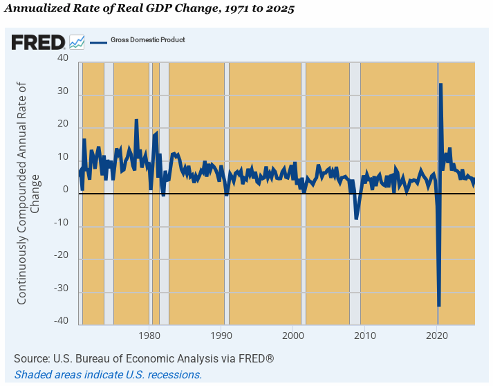 There is no contest on the growth and prosperity front, however, between the two periods. Real growth as measured by real final sales of domestic product rose at a 3.83% annual rate during the “light touch” era of Q2 1951 to Q2 1971, while the growth rate was barely half of that level at 1.94% between Q4 2007 and Q2 2025. Q.E.D.