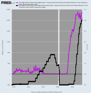 It’s actually very simple. The Fed needed to pretend that it was raising interest rates in a financial system flooded with rate-depressing excess liquidity. So it used the O/N RRP to set a floor under money market rates by sopping up massive amounts of excess liquidity, and then systematically raised the rate it pays overnight lenders from 5 basis points as recently as March 2022 to 480 basis points at present.