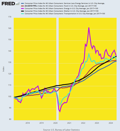 Y/Y Change In Five CPI Components, January 2017 to June 2024