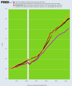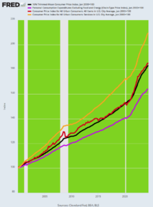 Indeed, the Fed goes so far in its Wall Street obeisance as to pick the very shortest inflation ruler published by the US government. As shown below, just since March 2018, the Fed’s preferred PCE deflator less food and energy (purple line) has risen materially more slowly than almost any other available measure including the headline CPI (red line), the 16% trimmed mean CPI (black line) and the CPI for all services (orange line).
