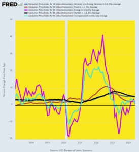 In any event, when you recast the first chart above on a Y/Y change basis, the true inflation trend gets completely obfuscated by the short-term fluctuations and noise in the data. Instead of bunching around the true 4% inflation trend of the past seven years, the rates of change for the LTM period ending in June 2024 are all over the lot. Among the same five biggie components of the CPI, services are still up 5% while energy whipsawed from +42% Y/Y in June 2022 to just +0.9% during the June 2024 LTM period.