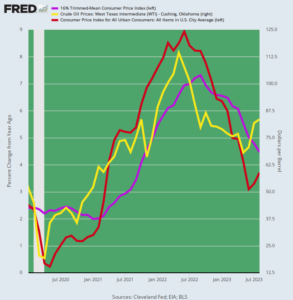 Of course, with variable lags and coefficients, the drunken sailor path of the crude oil price pulled the headline CPI (red line) and the more stable 16% trimmed mean CPI (purple line) along with it.  In the case of the former, the pre-pandemic headline CPI rate of 2.5% on a Y/Y basis in January 2020 plunged to just 0.2% by May 2020, and then was off to a wild romp, rising to 8.9% Y/Y in June 2022, then falling to just 3.0% by June 2023 before climbing higher again, to 3.3% in July.