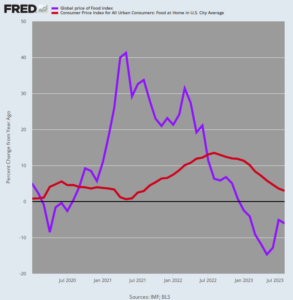 Y/Y Change in Global Food Index Versus Grocery Store Prices in the CPI, January 2020 to July 2023.