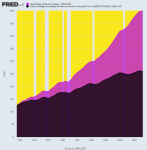 The answer, of course, is no can do. But for avoidance of doubt, here is the growth of hours worked in the nonfarm economy versus real GDP for the period 1964 through 2007. Total hours worked grew from 112.6 billion to 236.0 billion during that 43-year period or by 1.74% per annum.