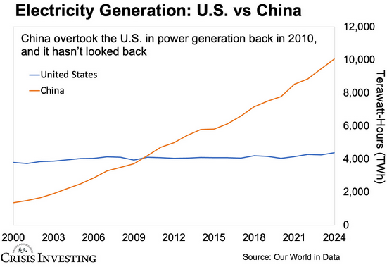 Because America has a serious problem. For a superpower trying to compete with another global power in a “national-priority” technology with a bottomless appetite for energy, the U.S. is already playing from behind—and badly. Take a look at this chart showing electricity generation in the U.S. versus China from 2000 to 2024.