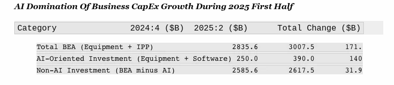 Of course, when you back out this AI investment explosion from the overall US investment spending numbers, what’s left is pretty punk. To wit, non-AI investment in US equipment and intellectual property in the fourth quarter of 2024 totaled $2.586 trillion, which figure rose by only $31.9 billion as of Q2 2025. So the annualized rate of gain was just 2.4% during the 2025 first half—a level far below the 12.2% annual gain in the AI-swollen BEA figure for total US equipment and intellectual property (first line) investment.