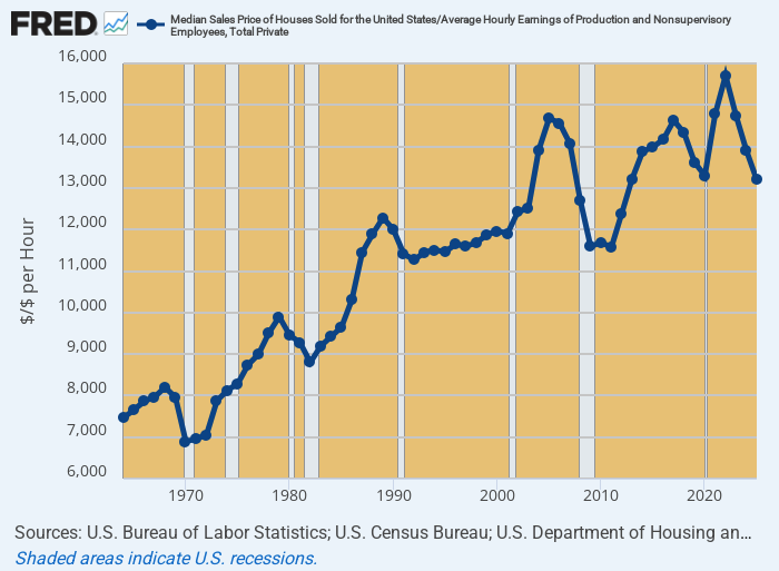Needless to say, as the Donald’s scrambles about seeking housing affordability “solutions”, we’d rather suspect that higher house prices are not quite what the economic doctor ordered. That is to say, during the last 55 years the number of hours an average worker needed to put on the clock in order to afford a median price US home has doubled—rising from 7,000 hours in 1963 to more than 14,000 hours or seven standard work-years worth of earnings in 2025.
