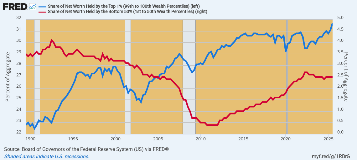 Household Net Worth: Top 1% Versus Bottom 50%, 1989 to 2025