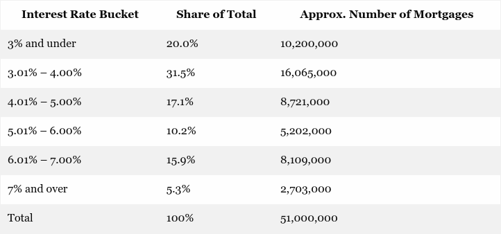 So as a practical matter, no one is going to see nominal 30-year mortgage rates below 5.0% any time soon. What that means is that there are now more than 10 million mortgages locked-in at deeply below market rates of 3.0% or under, while upwards of 25 million or nearly half of all home mortgages outstanding carry rates under 5.0%
