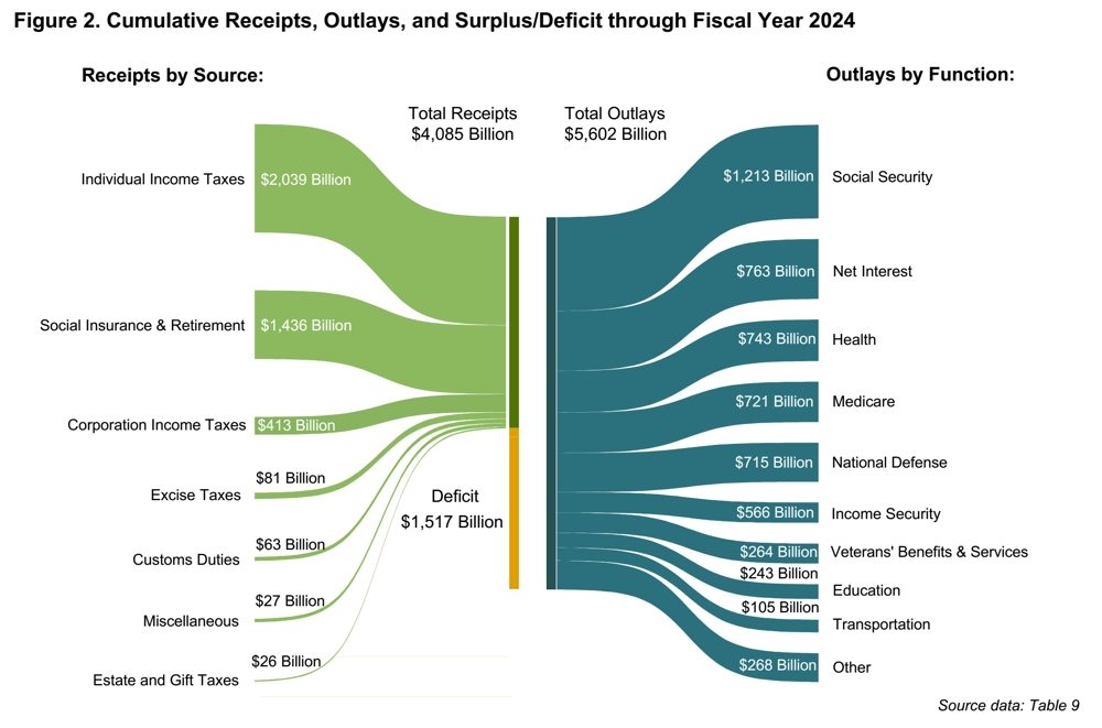 Below is a graphic from the US Treasury Department of the federal budget for Fiscal Year 2024. (Click image to enlarge.)