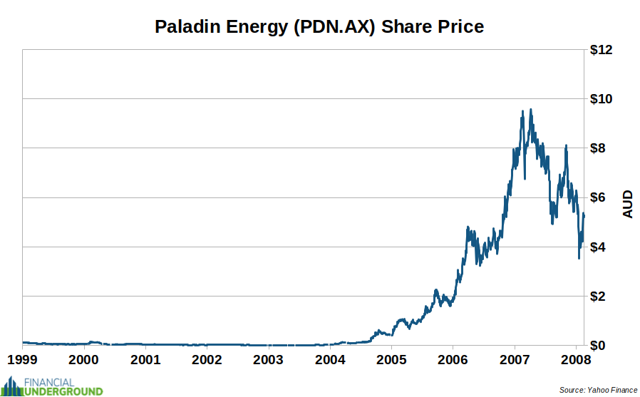 Rick was referring to Paladin Energy, a uranium stock that exploded during the last uranium bull market, rising from less than one cent (AUD $0.007) at its April 2003 low to AUD $9.57 at its peak in April 2007.