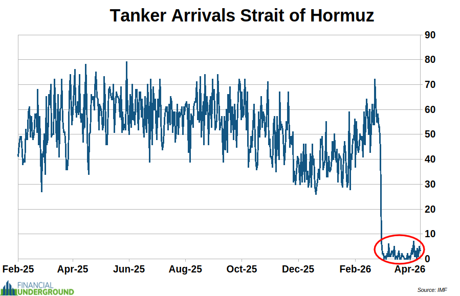 If you wanted to distill it down to a simple scoreboard of who is winning and who is losing the war, there is probably nothing better than the chart below, which shows oil tanker arrivals through the Strait of Hormuz.