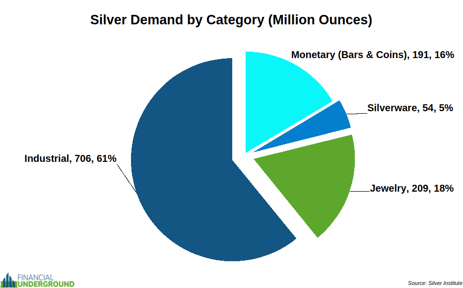 Silver is the opposite. It’s primarily an industrial metal, with monetary use making up only about 16% of total demand.